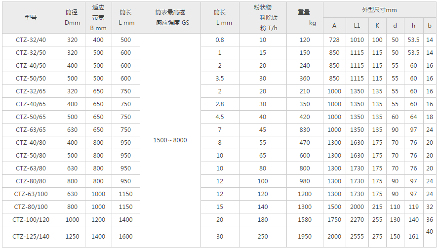 CTZ型中場強半磁滾筒(CTZ型中場強全磁滾筒結構與RCT型參數等同),多用于對粉狀、顆粒狀、小塊狀物料的凈化處理,或對鐵質的回收利用,對防止研磨機、壓榨機的破壞和磨損起著可靠的保護作用。它安裝方便、吸力強、低能耗、連續工作、操作簡單。