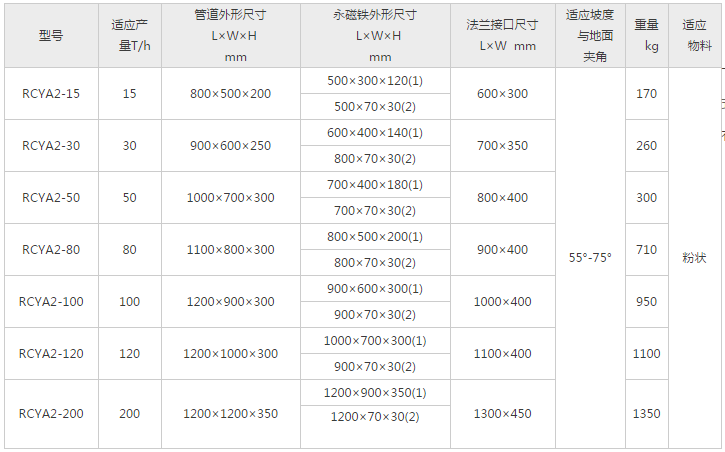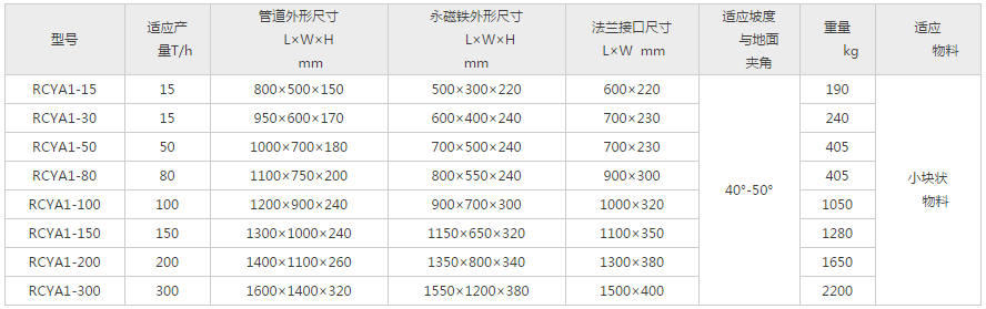 RCYA型傾斜管道式永磁除鐵器分為RCYAl、RCYA2兩種,包括無磁管道和永磁鐵兩部分,專用于封閉管道內(nèi)非磁性物料的除鐵,永磁除鐵器內(nèi)部采用高性能強磁材料組成復(fù)合磁系。具有體積小、磁力大、重量輕、除鐵干凈、方便、低能耗、使用壽命長等特點。